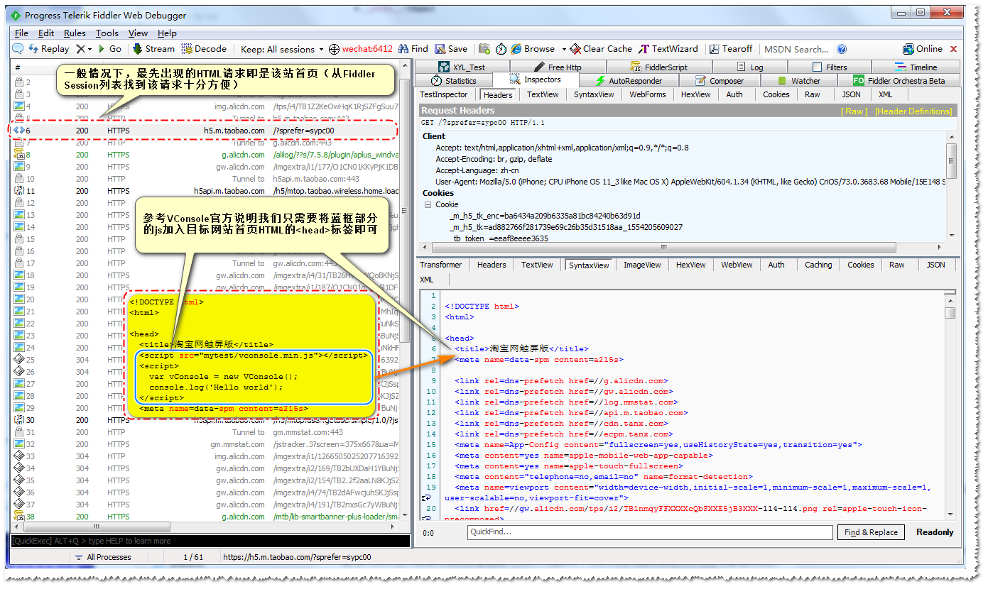 将手机连接filddle代理,使用手机浏览器进入淘宝网,在filddle左侧session列表我们很容易找到taobao的首页HTML